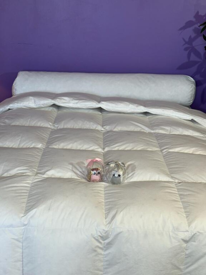La couette est composée de duvet de canard blanc neuf, 90% flocons.